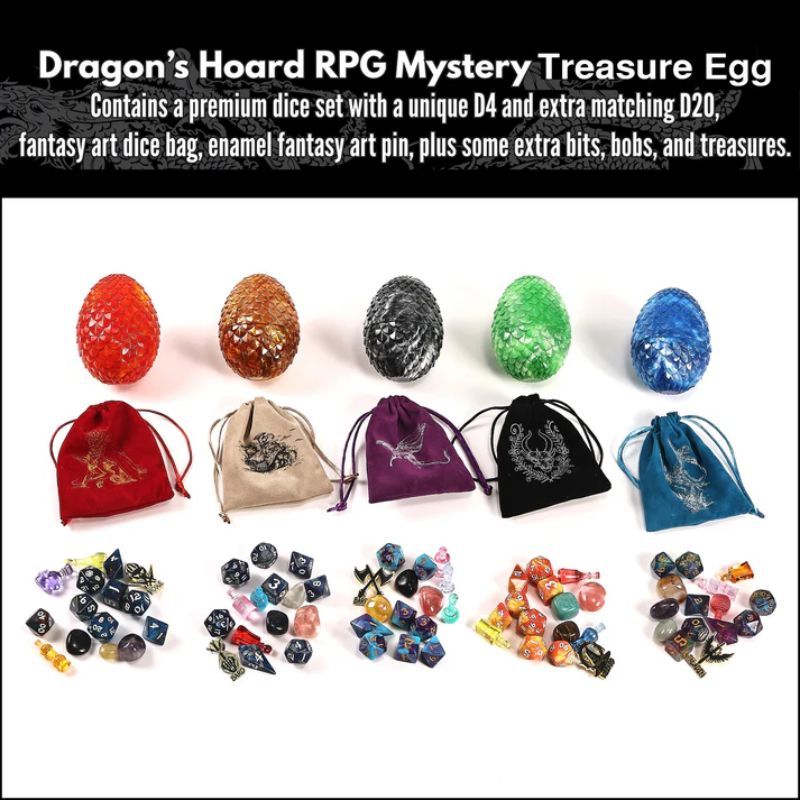 Dragon's Hoard RPG Mystery Loot Egg include un set premium de zaruri, un săculeț de zaruri cu artă fantasy, un pin și diverse mici comori, toate ascunse într-un ou de dragon colorat aleatoriu.