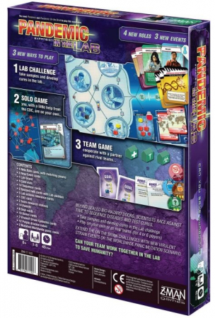 În plus față de Lab Challenge, In the Lab oferă două variante care schimbă complet experiența de joc Pandemic. Acum poți să te lupți singur cu bolile într-un joc solo sau puteți să vă împărțiți în două echipe rivale și să vă întreceți pentru a vindeca și eradica bolile, a preveni epidemiile și a câștiga prestigiu. Dacă vă împărțiți în echipe rivale, vindecarea bolilor este în continuare scopul final, dar prestigiul pe care l-ați câștigat pe parcursul jocului determină câștigătorul. Împreună cu cele patru noi cărți de rol, cele trei noi cărți de eveniment și cu provocările pe care le puteți combina cu cele din extensia On the Brink, In the Lab creează un univers complet nou cu o mulțime de posibilități pentru jocul Pandemic.
