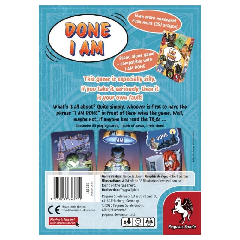 Done I Am este un joc de cărți haotic și plin de umor, care poate fi jucat individual sau combinat cu I Am Done, conținând 83 de cărți noi ilustrate de 35 de artiști.