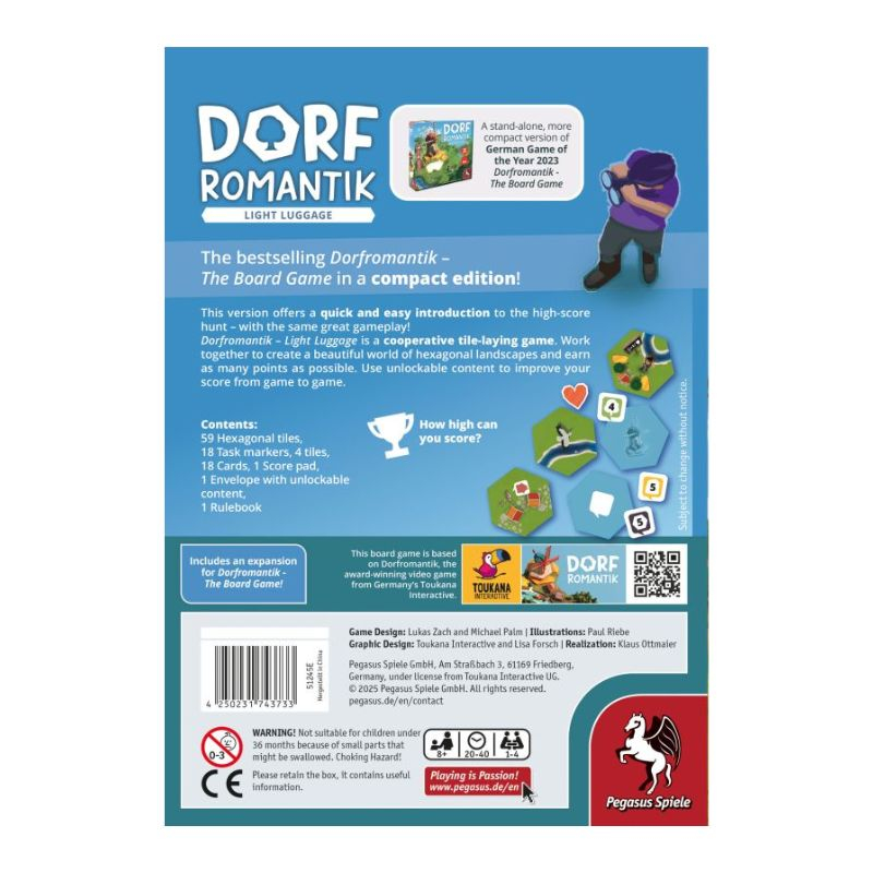 Jucătorii colaborează pentru a crea peisaje armonioase, a îndeplini cerințele locuitorilor și a construi râuri cât mai lungi, obținând puncte pentru plasarea inspirată a plăcuțelor hexagonale. Pe măsură ce avansezi în campania inclusă, vei adăuga noi plăcuțe și vei îndeplini cărți de obiectiv, iar un plic secret ascunde surprize ce se deblochează pe parcurs. Cu o cutie magnetică practică și un sistem de progres ușor, Dorfromantik: Light Luggage este atât o introducere excelentă în universul Dorfromantik, cât și o provocare proaspătă pentru jucătorii experimentați. Această versiune a jocului este de sine stătătoare.