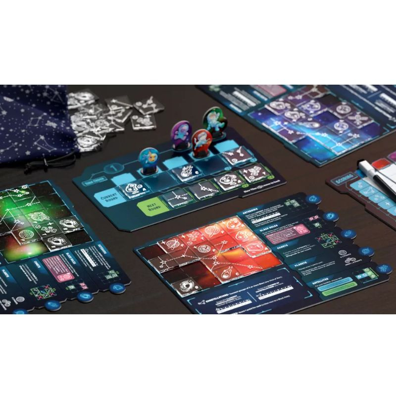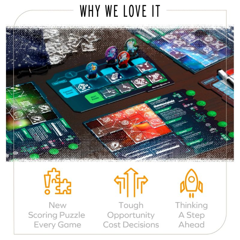 Pe parcursul jocului, vei conecta constelații, vei construi centuri de asteroizi, vei aduna comete și vei studia planetele cu ajutorul sateliților, fiecare element având propriul mod de punctare. Cu 10 condiții de scor ce pot fi combinate în 32 de moduri diferite, fiecare partidă de joc este provocatoare. Ordinea variabilă a turelor, determinată de plăcuța pe care o tragi, adaugă un plus de strategie, iar aplicația opțională pentru punctaj calculează scorul printr-o simplă scanare a tablei.