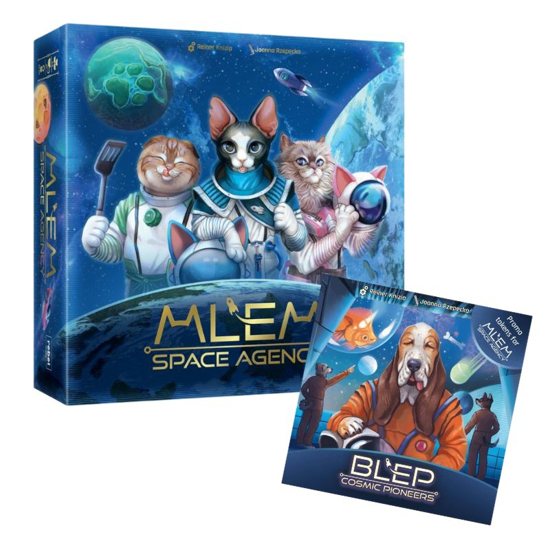 BLEP: Cosmic Pioneers readuce rivalitatea ancestrală dintre pisici și câini direct în spațiu, după ce felinele descoperă că patrupedele rivale au ajuns deja pe stele îndepărtate. Extensia adaugă șase jetoane cu câini care se plasează pe tabla de joc, oferind o variantă suplimentară de joc ce influențează deciziile și riscurile fiecărei misiuni. Această extensie este destinată fanilor MLEM: Space Agency care vor mai multă varietate și un plus de interacțiune în cursele lor cosmice. BLEP: Cosmic Pioneers este o extensie și necesită jocul de bază MLEM: Space Agency pentru a fi jucată.