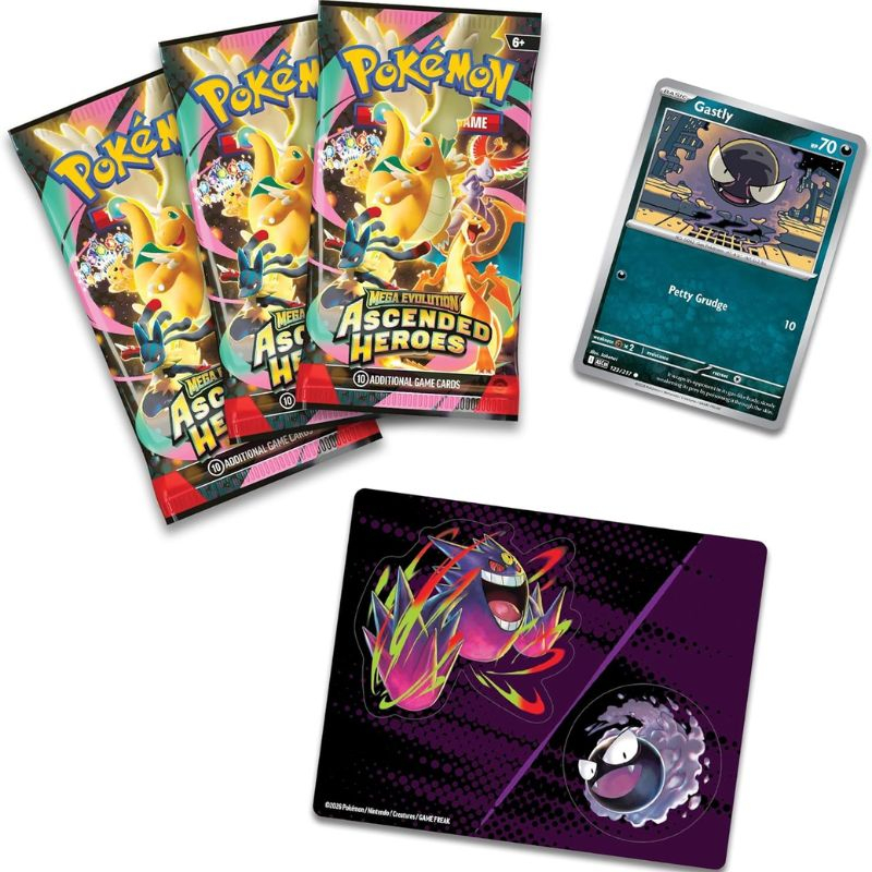 Pokemon - Mega Evolution Ascended Heroes - Tech Sticker Collection - Gastly este o colecție care include o carte promo foil cu Gastly, o foaie de stickers și trei boostere Mega Evolution - Ascended Heroes.